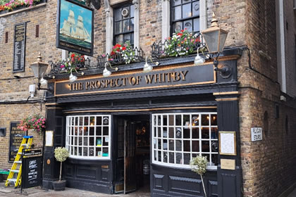 Sadly, it is not possible to access the river side here so continue to walk along the wall for around 300m until you reach “The Prospect of Whitby” tavern on the right hand side of the road.